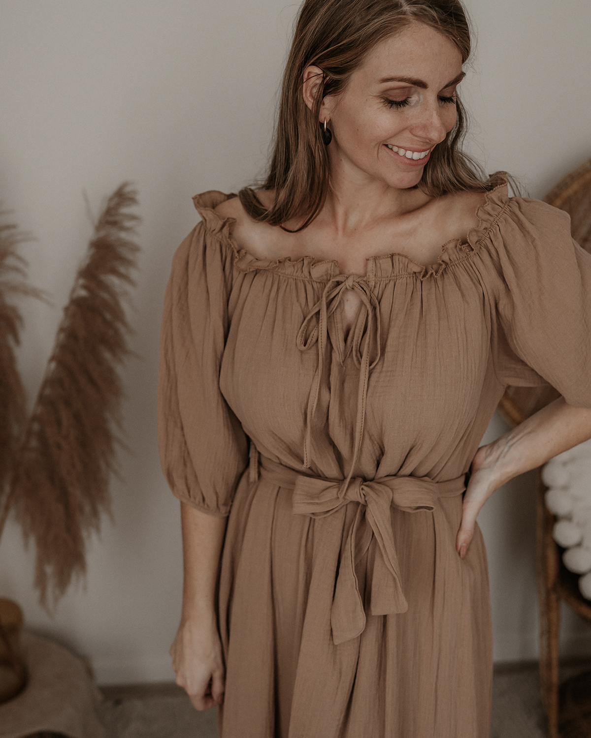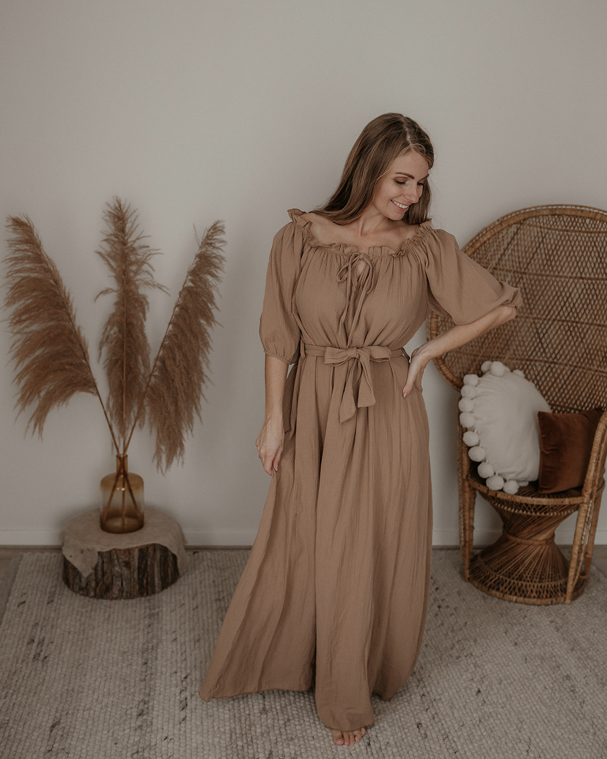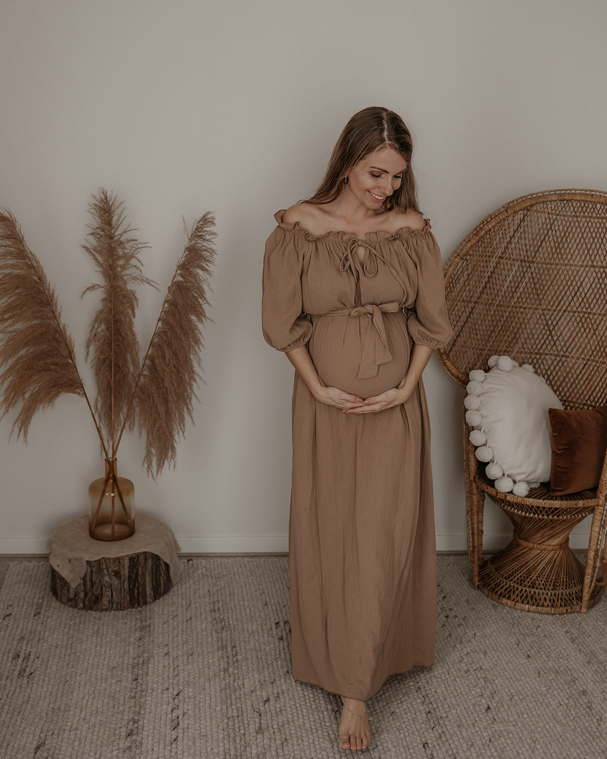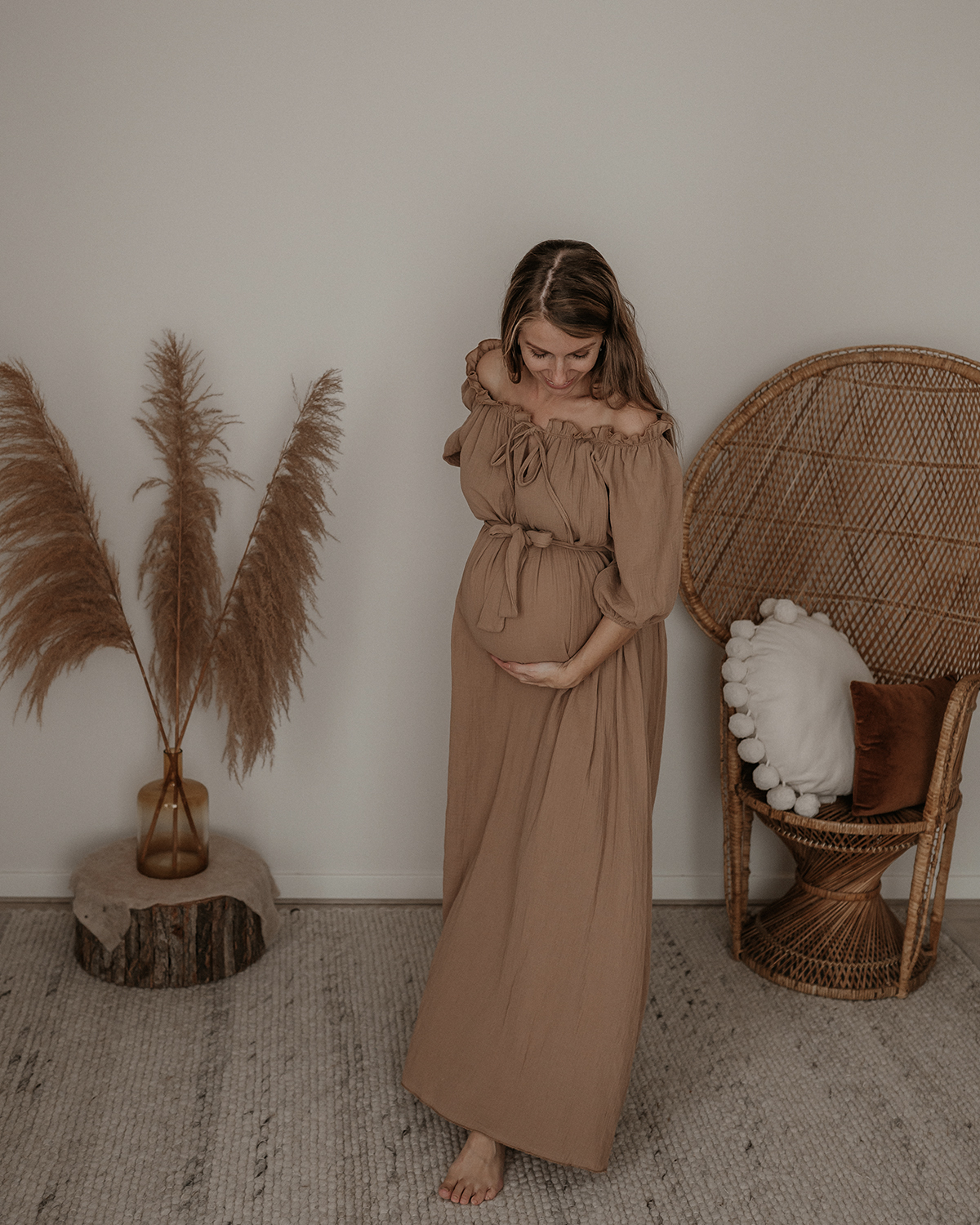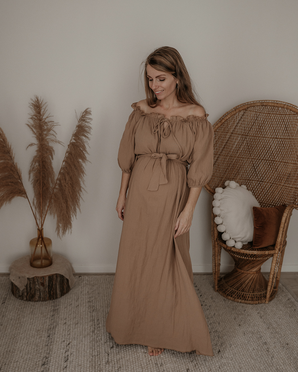 Hele mooie bruine off shoulder jurk met een ceintuur. De jurk zit echt prachtig en is heel erg mooi voor bij een fotoshoot. Je kan de jurk zowel zwanger als niet zwanger dragen. De maat is One size en te dragen van maat XS t/m L.